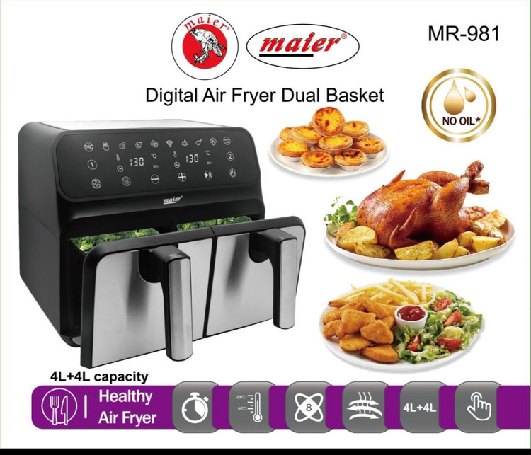 سرخکن دوقلو مایر آلمان با کیفیتی و طراحی خاصی که دارد زیبایی خاصی به خانه و آشپزخانه شما میبخشد،این سرخکن علاوه بر زیبا قابلیتهای بسیاری دارد،از مهمترین قابلیت این محصول میتوان به ۲سبده بودن این دستگاه اشاره کرد،این دستگاه دارای ۲ سبد می باشد و هر سبد ظرفیت ۴ لیتر دارد که می توان به صورت همزمان از ۲ سبد استفاده کرد.