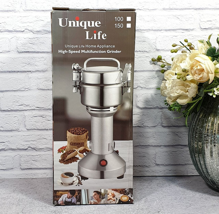 آسیاب نیمه صنعتی یونیک لایف با گنجایش مخزن۱۵۰ گرمی و توان ۱۲۰۰ وات یک آسیاب خانگی و صنعتی پر قدرت است که حتی سنگ را برای شما آسیاب می کند. این اسیاب قهوه دارای تیغه ۶ پره فولادی ضد زنگ، ۲ عدد زغال اضافه، ۲ عدد تیغه اضافه بلند، ۲ عدد تیغه اضافه سر بالا، درب واشر دار، قفل حرفه ای، فیوز اطمینان، فرچه تمیز کننده مخزن، بدنه از جنس استیل و چدن، پایه های ضد لغزش و سرعت موتور ۲۸ هزار دور در دقیقه است.